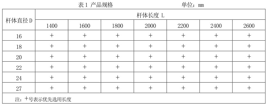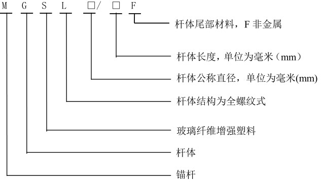 示例:公稱直徑為20mm,長度為1800mm,桿體尾部結構為非金屬材料的全螺紋式樹脂錨桿玻璃纖維增強塑料桿體,可標記為MGSL20/1800F。