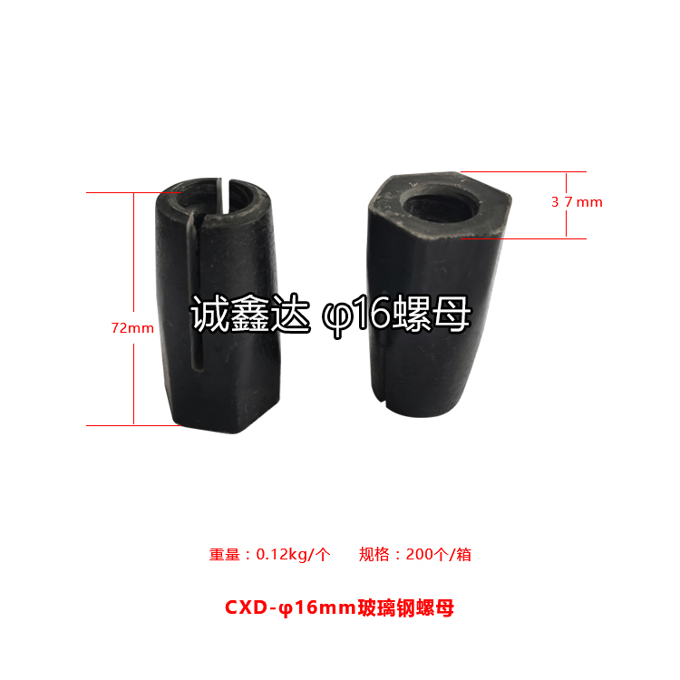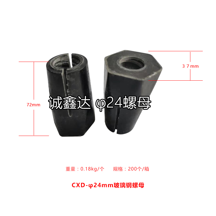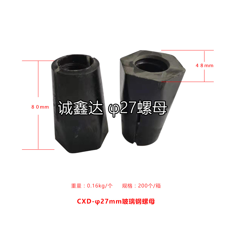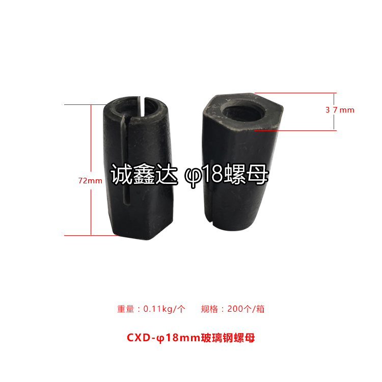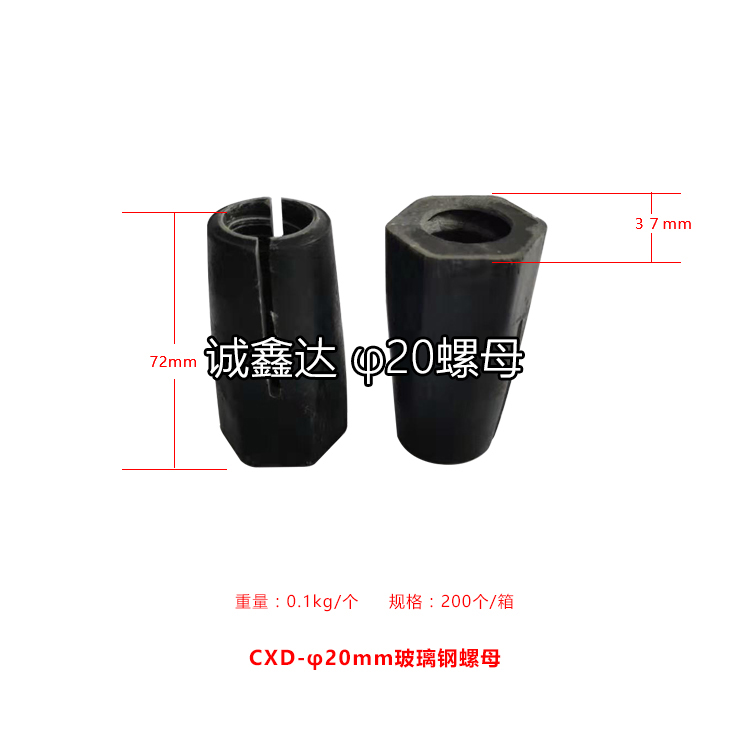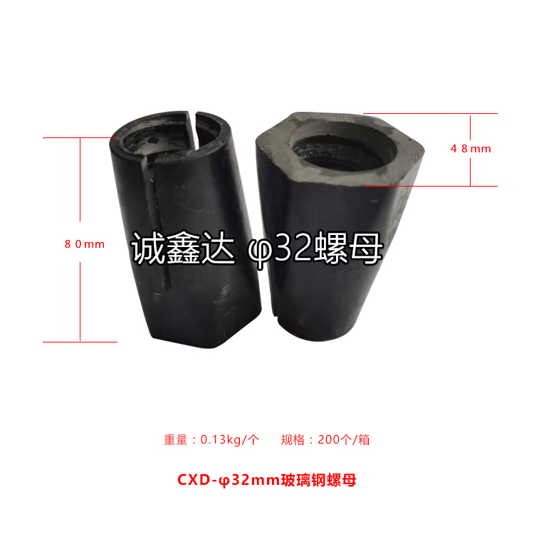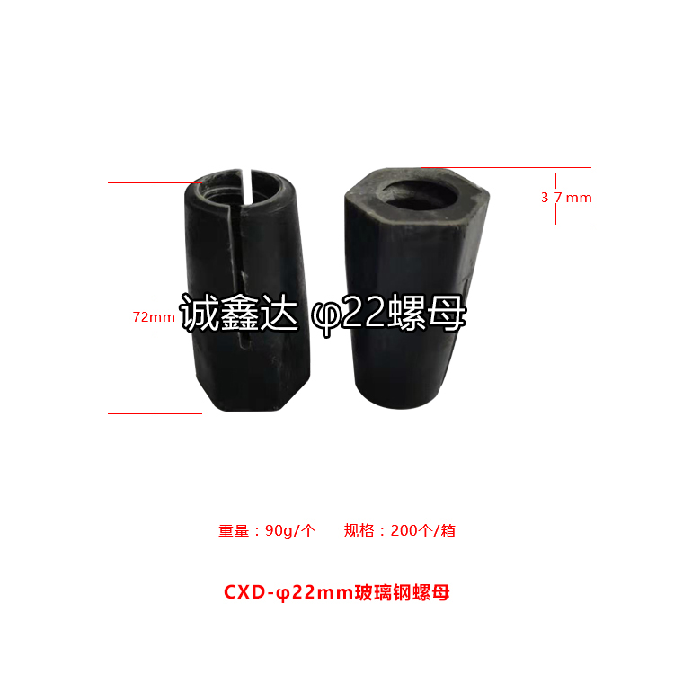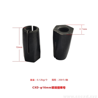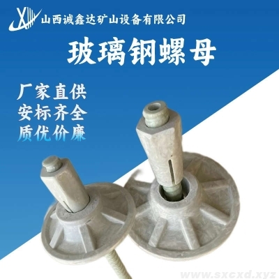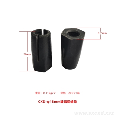 作為礦山支護(hù)配件,山西誠(chéng)鑫達(dá)研發(fā)了一種高抗拉強(qiáng)度的玻璃鋼螺母,螺母本體開有內(nèi)螺紋孔,在內(nèi)螺紋孔孔壁設(shè)螺紋,螺母本體的前部分外形為錐形且用于與托盤緊密配合,在螺母本體的前部分的錐形面開設(shè)有通槽,螺紋孔的前部呈喇叭形,這樣螺紋孔的前端直徑大于后端的直徑,進(jìn)入托盤錐形孔后,螺母本體的前端和中部同時(shí)收縮,使螺母本體的內(nèi)螺紋與錨桿外螺紋緊密配合,拉緊長(zhǎng)度增加到25mm—30mm,擴(kuò)散了應(yīng)力,使抗拉強(qiáng)度明顯提高。