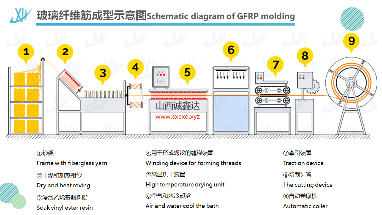 放在紗架上的玻璃纖維紗由于尾部牽引系統(tǒng)的作用,通過(guò)過(guò)絲板,送到了浸料槽,進(jìn)料槽內(nèi)有樹(shù)脂,玻璃纖維紗在進(jìn)料槽內(nèi)浸滿了樹(shù)脂,然后在通過(guò)預(yù)成型系統(tǒng)合攏成束,在模具內(nèi)經(jīng)過(guò)加熱器加熱熔融,通過(guò)液壓系統(tǒng)擠壓成型,在通過(guò)纏繞系統(tǒng),成為全螺紋玻璃纖維塑料桿體,(在進(jìn)料槽、預(yù)成型系統(tǒng)、纏繞系統(tǒng)前端有硅膠片,作用是保證桿體光滑,無(wú)氣泡)然后進(jìn)入烘干系統(tǒng)進(jìn)行固化,經(jīng)過(guò)切割組件將桿體切割成所需要的長(zhǎng)度,經(jīng)過(guò)品管員的檢驗(yàn),入庫(kù)。